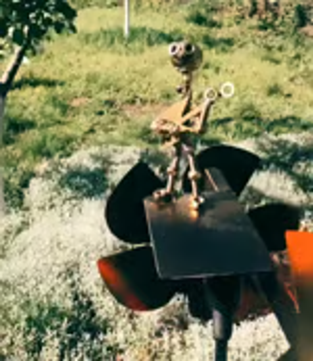Rustikaler Industriestil: Die Metalloberfläche des Windrads und der gitarrenförmige Pfeil verleihen dem klassischen Windmühlendesign eine einzigartige Note und bringen einen industriellen, rockigen Touch in jede Außenumgebung.