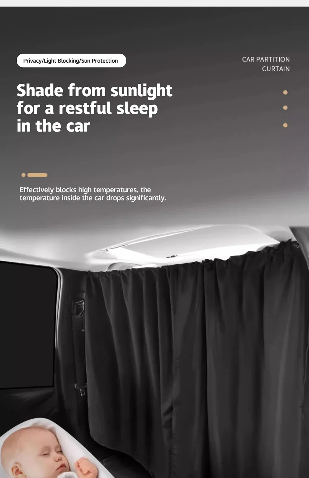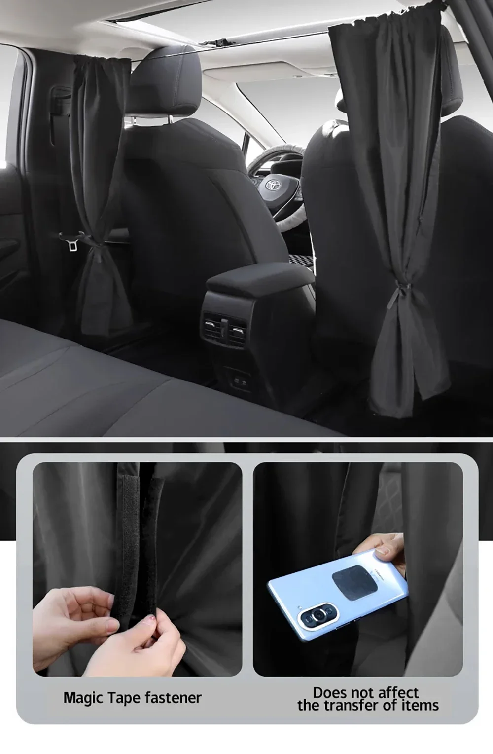 1.Personal Privacy Space: The car isolation curtain in our vehicle provides you with a personal retreat for enjoying your favorite activities in privacy. It also acts as a sunshade, protecting your skin from harmful UV rays while enhancing air conditioning efficiency, saving energy in the process.