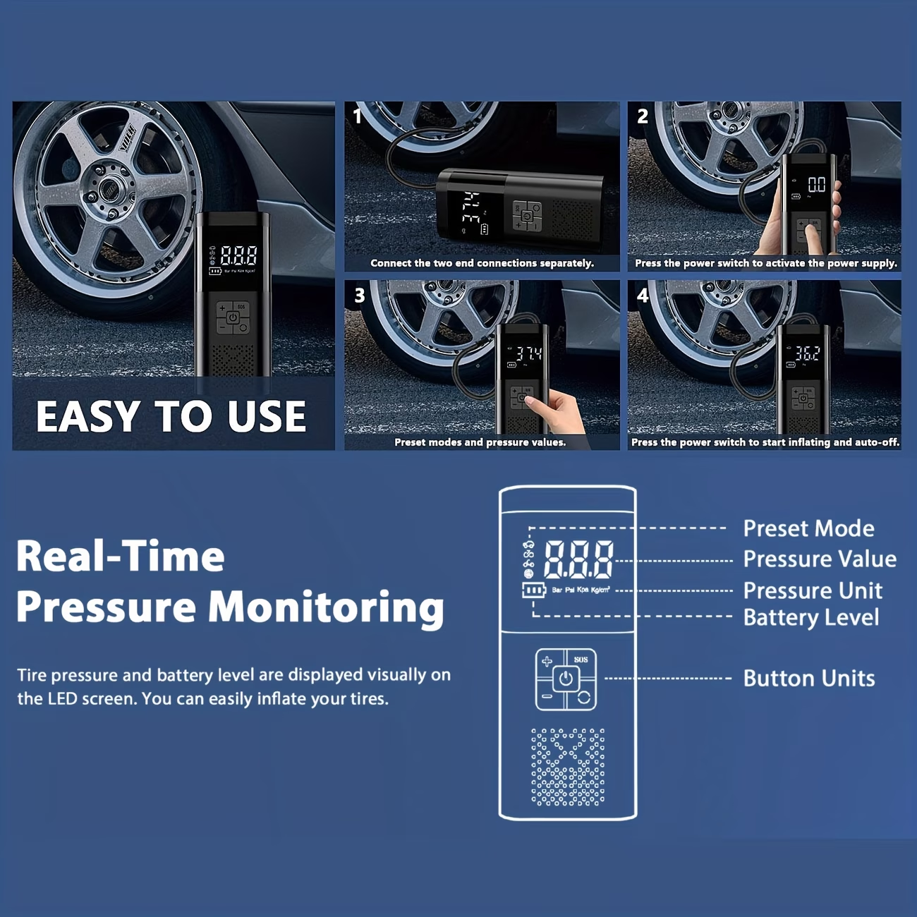 【𝗔𝗰𝗰𝘂𝗿𝗮𝘁𝗲 𝗟𝗖𝗗 𝗗𝗶𝘀𝗽𝗹𝗮𝘆 𝗮𝗻𝗱 𝗔𝘂𝘁𝗼𝗺𝗮𝘁𝗶𝗰 𝗦𝘁𝗼𝗽】The car tire air pump comes with a built-in pressure gauge and LCD screen that allows you to accurately monitor real-time tire pressure. The preset tire pressure function allows the pump to automatically shut off when the correct pressure is reached, preventing over-inflation and ensuring optimal tire performance and safety